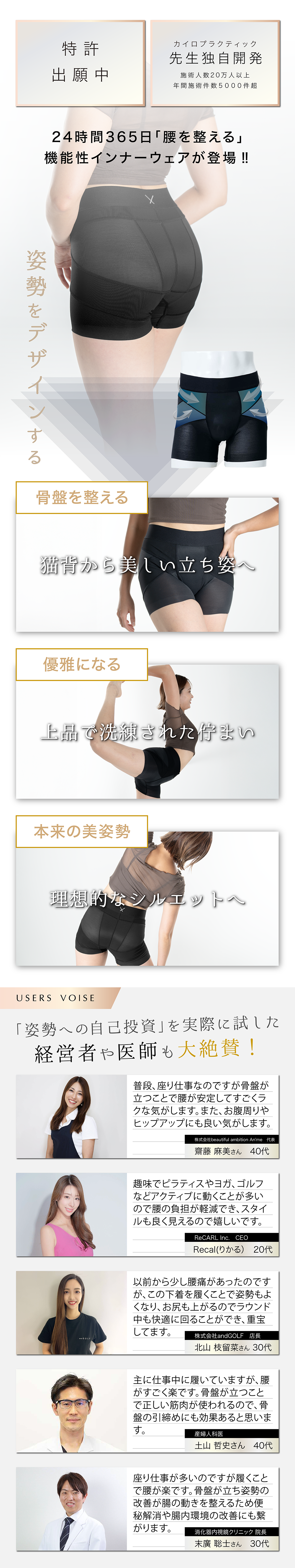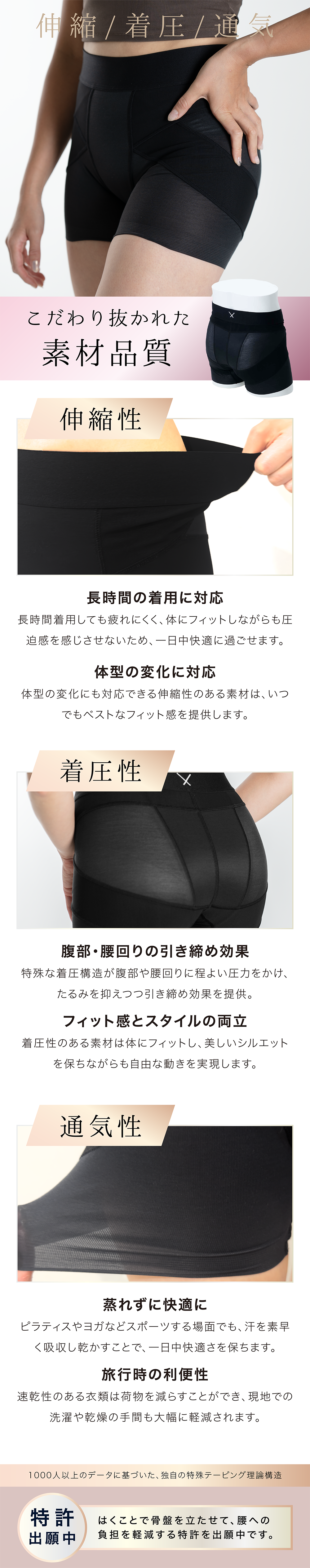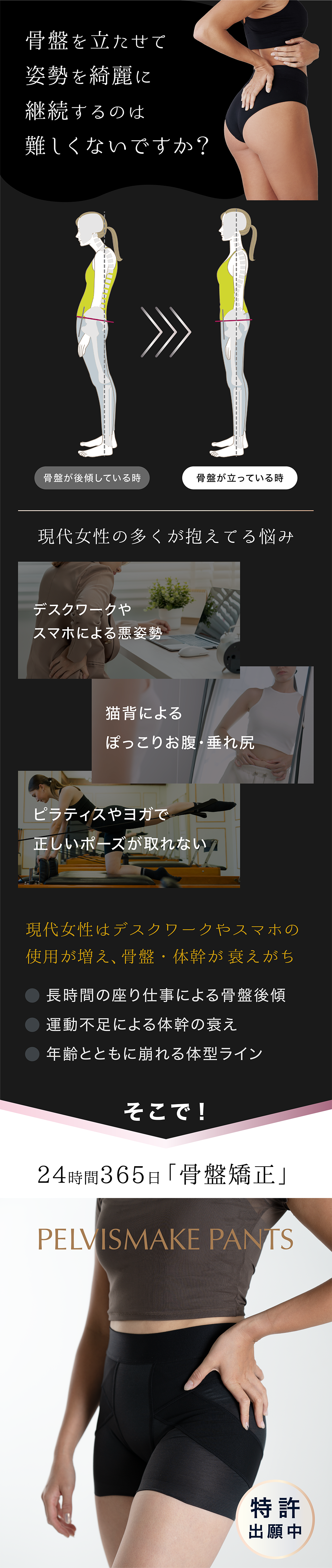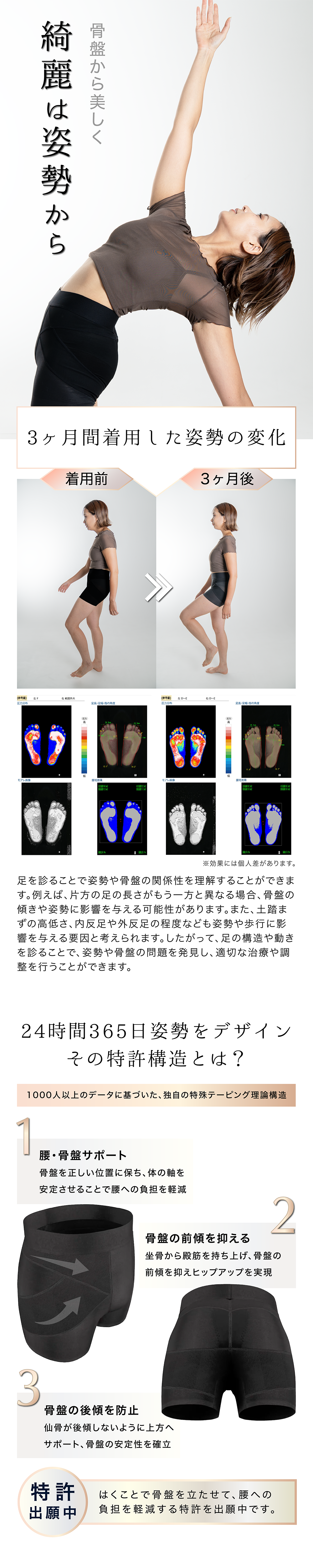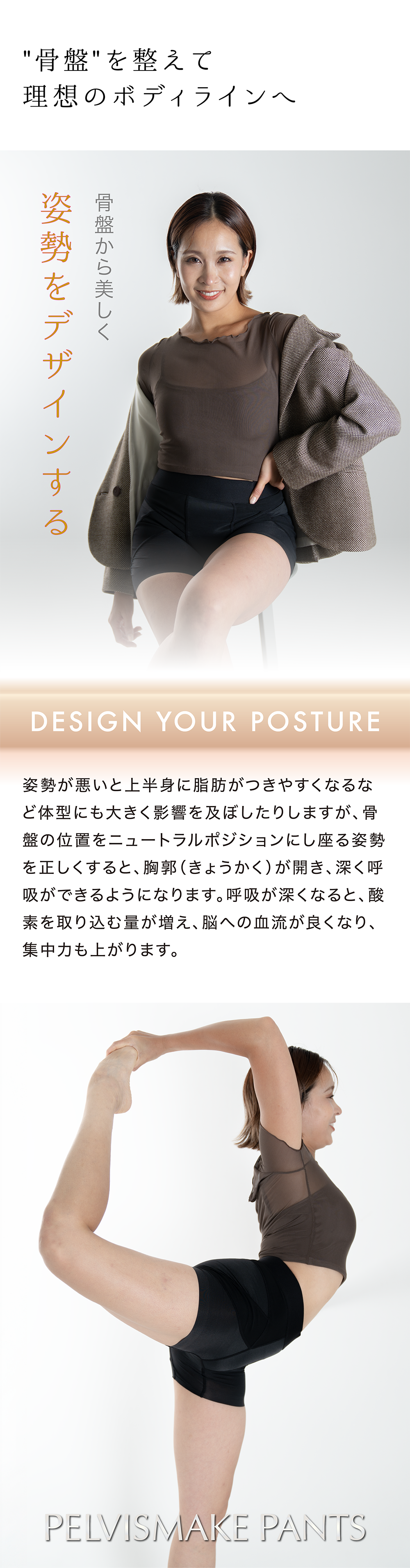 骨盤を立たせ、正しく美しい姿勢をデザインするよう独自で研究開発した2つのサポートを前面と背面に設計しています。
